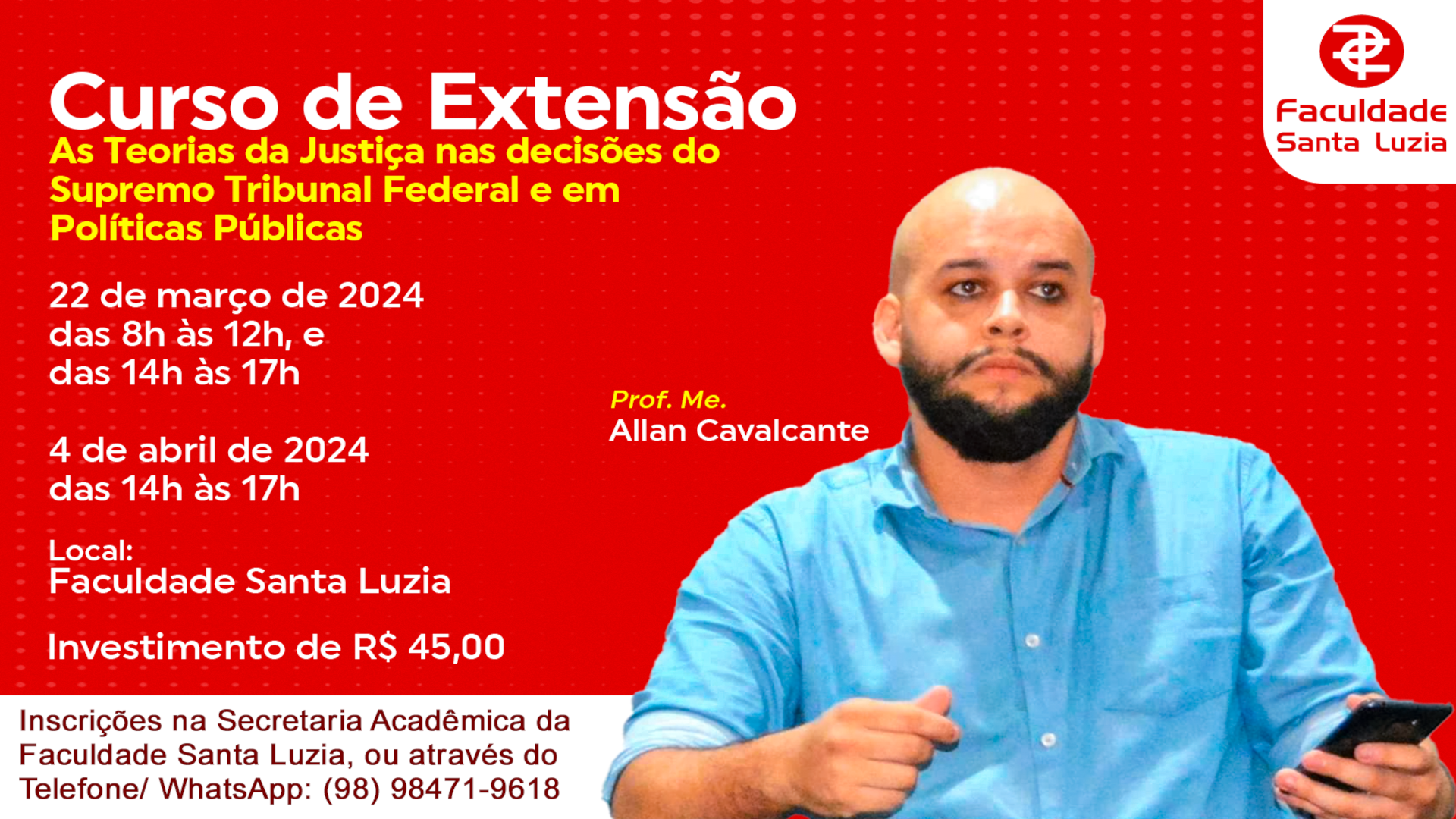 - Inscrições: Secretaria Acadêmica da Faculdade Santa Luzia, ou através do Telefone/ WhatsApp: 98 98471-9618